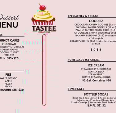 It all started with watching mom in the kitchen making those sweet potato pies and cobblers. Using nothing but the purest of butter, flour, eggs, milk and real vanilla. The aroma filled the air as the smell of something sweet is about to make its presence soon. Many years later, we still use the freshest ingredients that makes our desserts worth the wait. People eat with their eyes first, then the mouth follows...treat yourself.